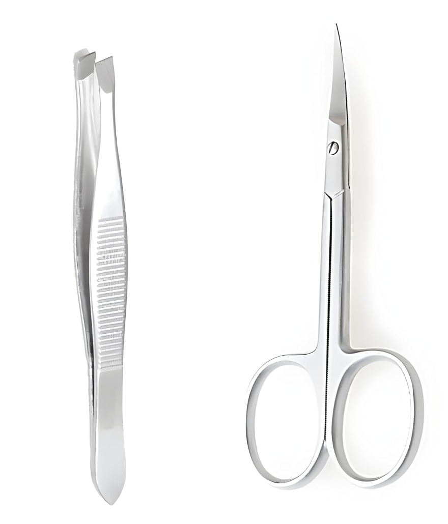 Essential tools for grooming and shaping eyebrows. Scissors trim unruly brow hairs, while tweezers help remove stray hairs for a polished look.