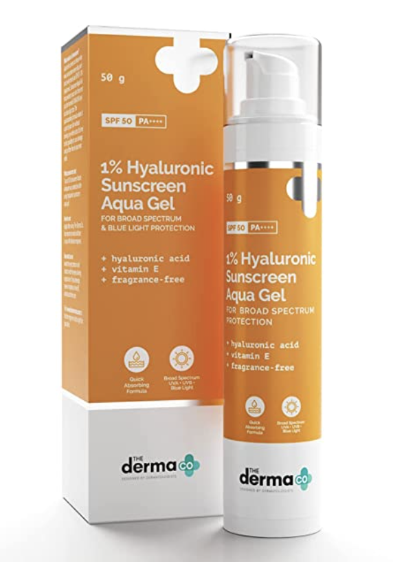 The Derma Co 1% Hyaluronic Sunscreen Aqua Ultra Light Gel with SPF 50 PA++++ For Broad Spectrum, UV A, UV B & Blue Light Protection, Ceramide & Hyaluronic Acid Moisturiser for Normal To Dry Skin, Dot & Key Vitamin C + E SPF 50 Sunscreen.